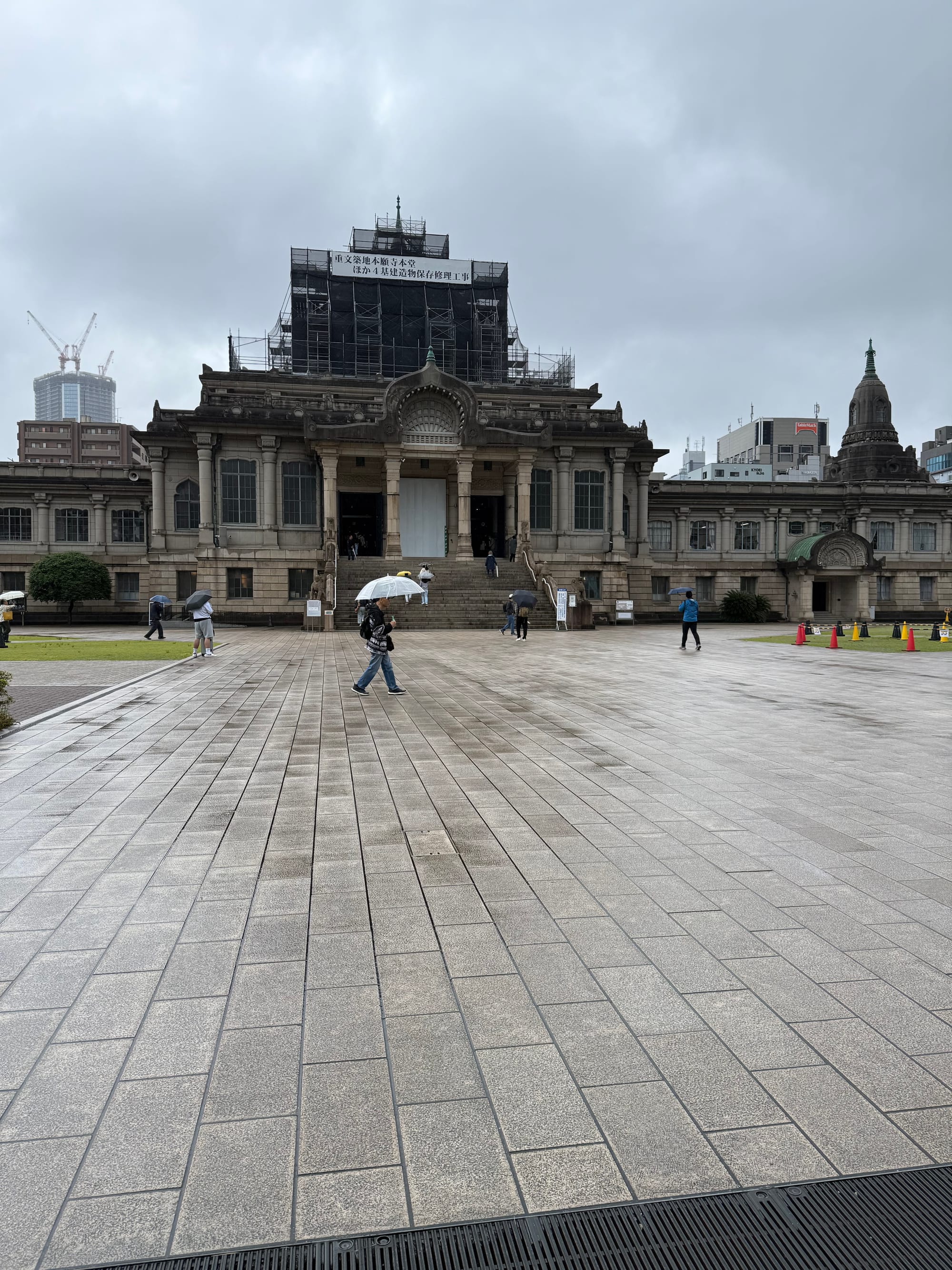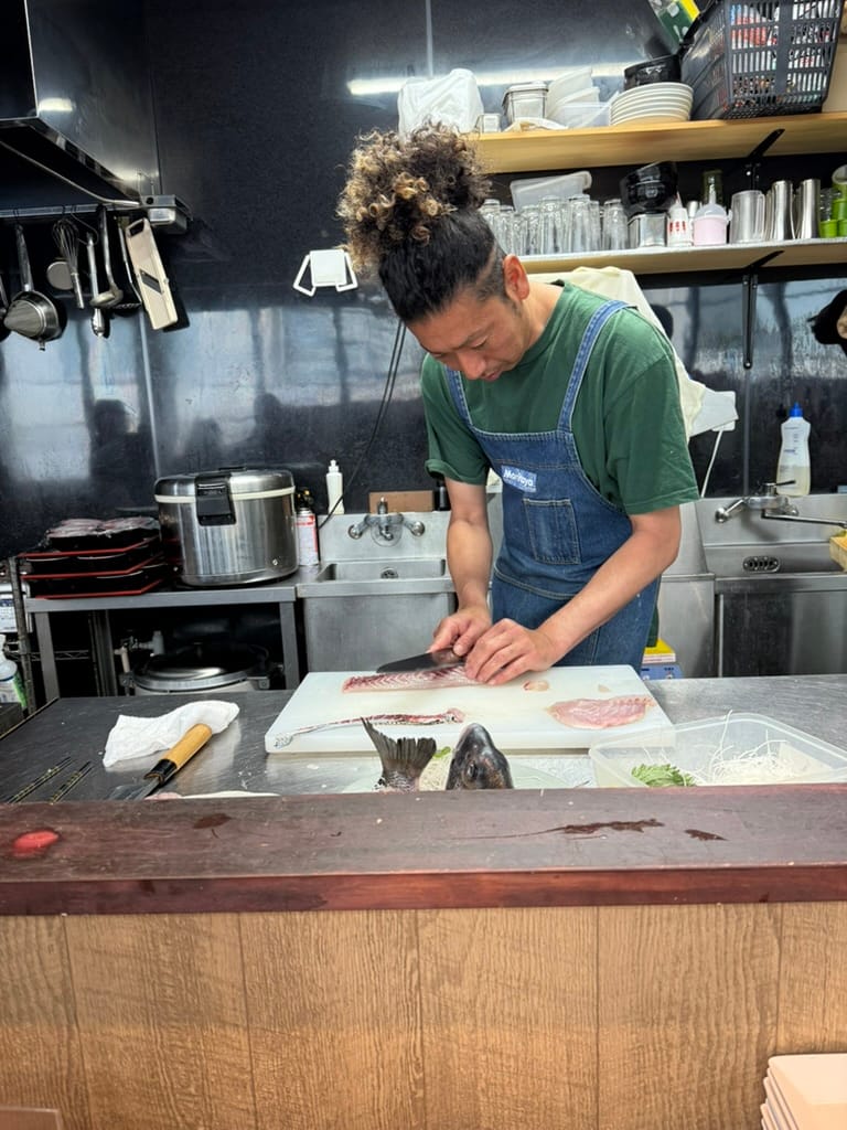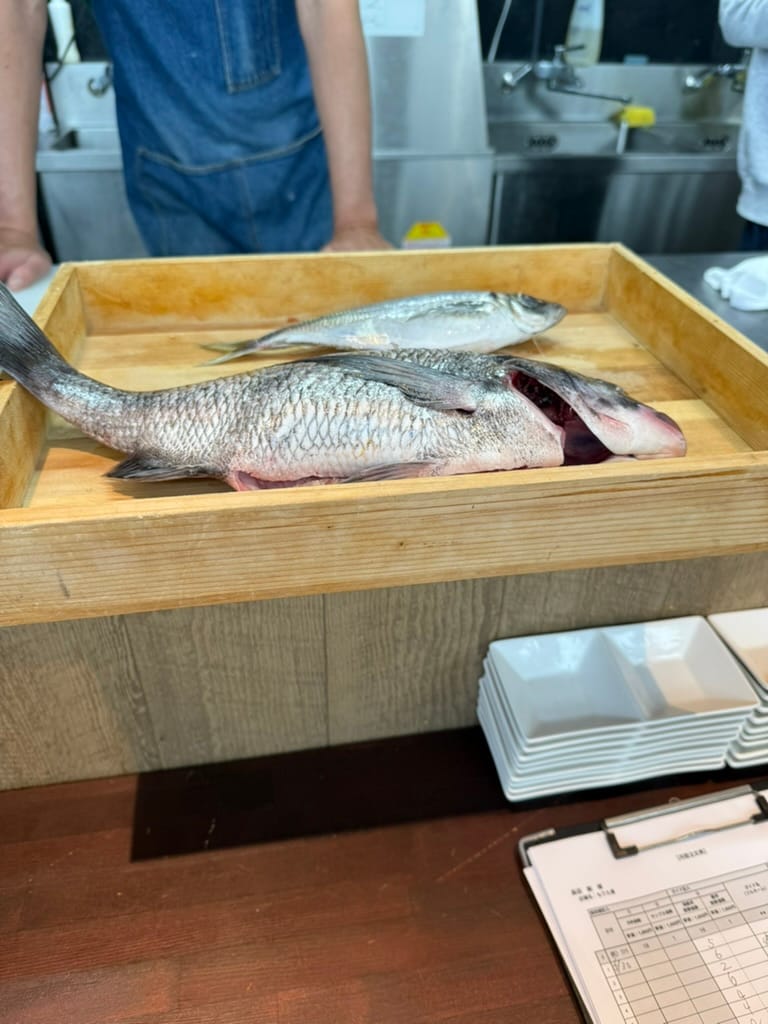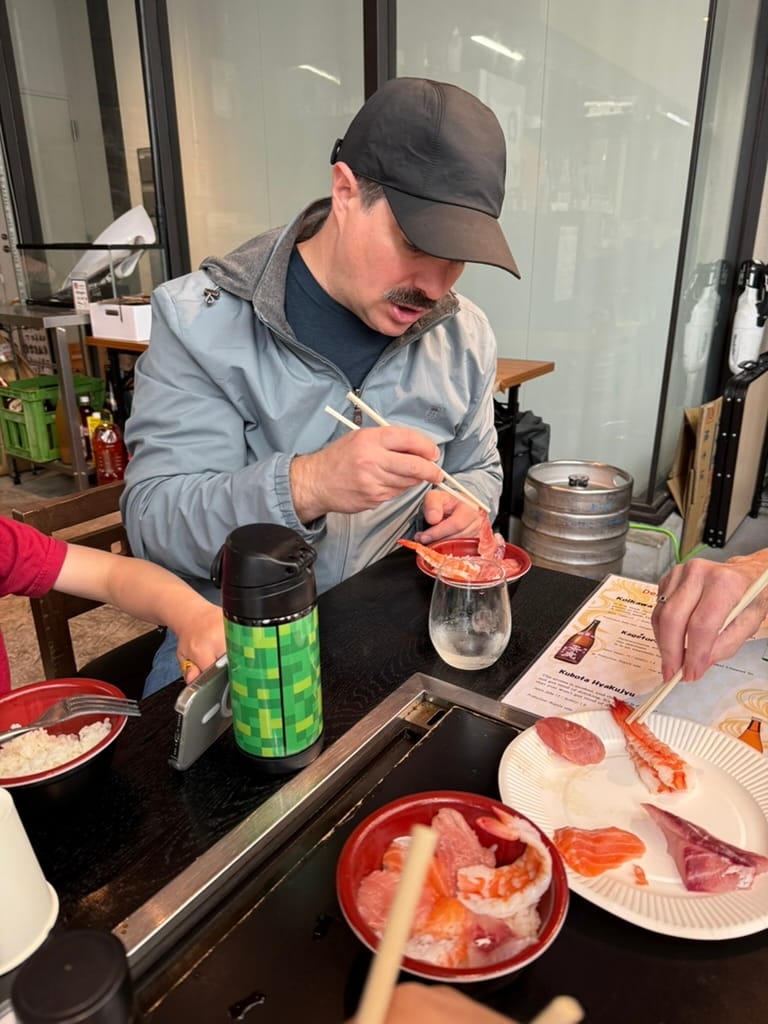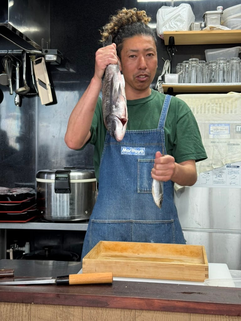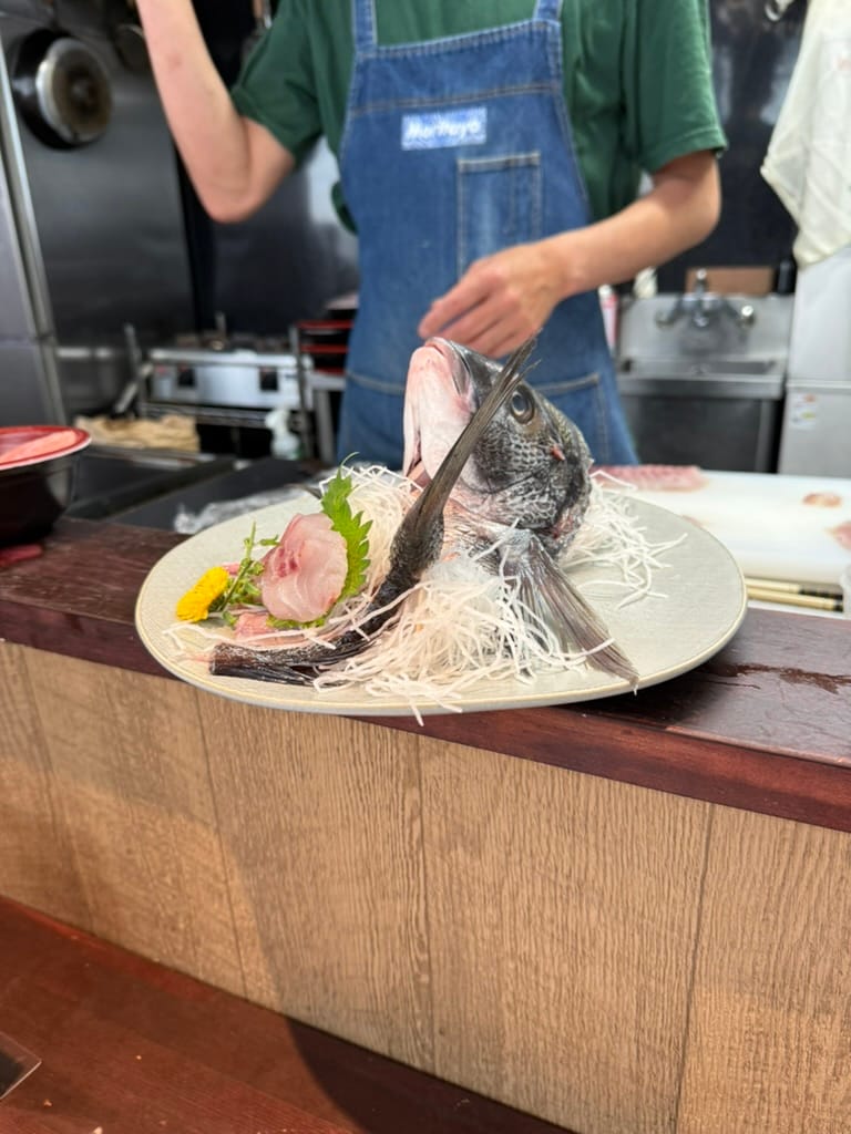 This morning it was raining and looked like it was going to rain the entire day. We met up with our tour guide, a Japanese college student here in Tokyo. He showed us around a near by Buddhist temple. It was very interesting to see the inside and learn about some of the local customs regarding prayer and worship. After the temple we headed over to the famed Tsukiji market. The market is a sprawling mass of retail vendors, covering a few city blocks. There are nearly 500 vendors selling everything from fish, vegetables, wagyu beef, knives, ceramics and everything in between. We meandered through the vast array of stalls for a couple hours tasting samples and looking at the interesting things for sale, all while trying to avoid the rain. The last stop of our tour, our guide took as to a fish cutting demonstration where we got to watch a chef cut up and present a fish. Afterwards we got to use the fish to create out own fish bowls and then eat them. It was a fun experience!