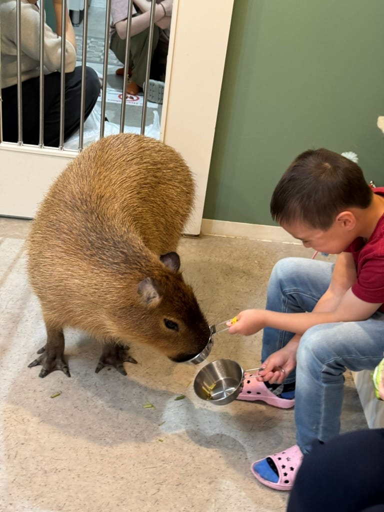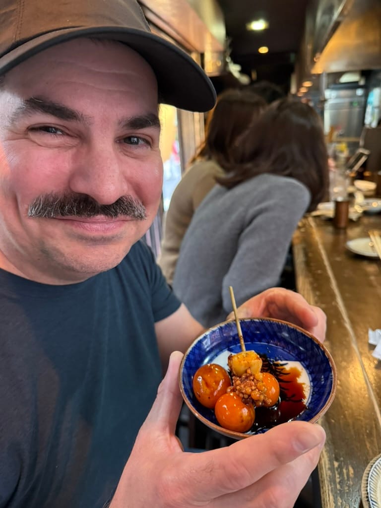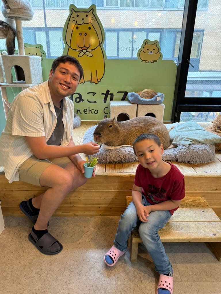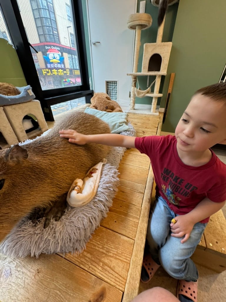 After our big morning at the market, we took Matthew and Nico to another animal cafe. This one was a capybara and cat cafe. It was really hard to get a reservation there so only Matthew and Nico could go. They had so much fun! When we met up with them again afterwards Nico had the biggest smile on his face. While Matthew and Nico were enjoying the animals, Lee and I found a tiny little restaurant around the corner where we enjoyed a couple of drinks while we were waiting. As we were sitting there, we kept seeing the cook make, what I thought looked like cherry tomatoes, except they weren't. Lee browsed through the menu and found it. It was barbecued chicken ovaries. Lee pressured me into trying it. The cook brought it to us and explained you are meant to eat it all in one bite. So I did, the visuals and texture were not appetizing at all, nor was the popping of the ovaries when I bit down, but the flavor was actually quite good. It tasted like creamy eggs. Would I do it again? No thanks.