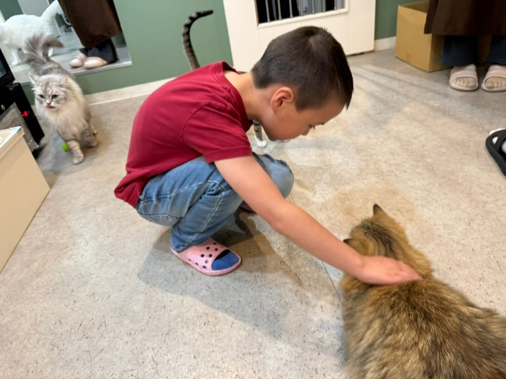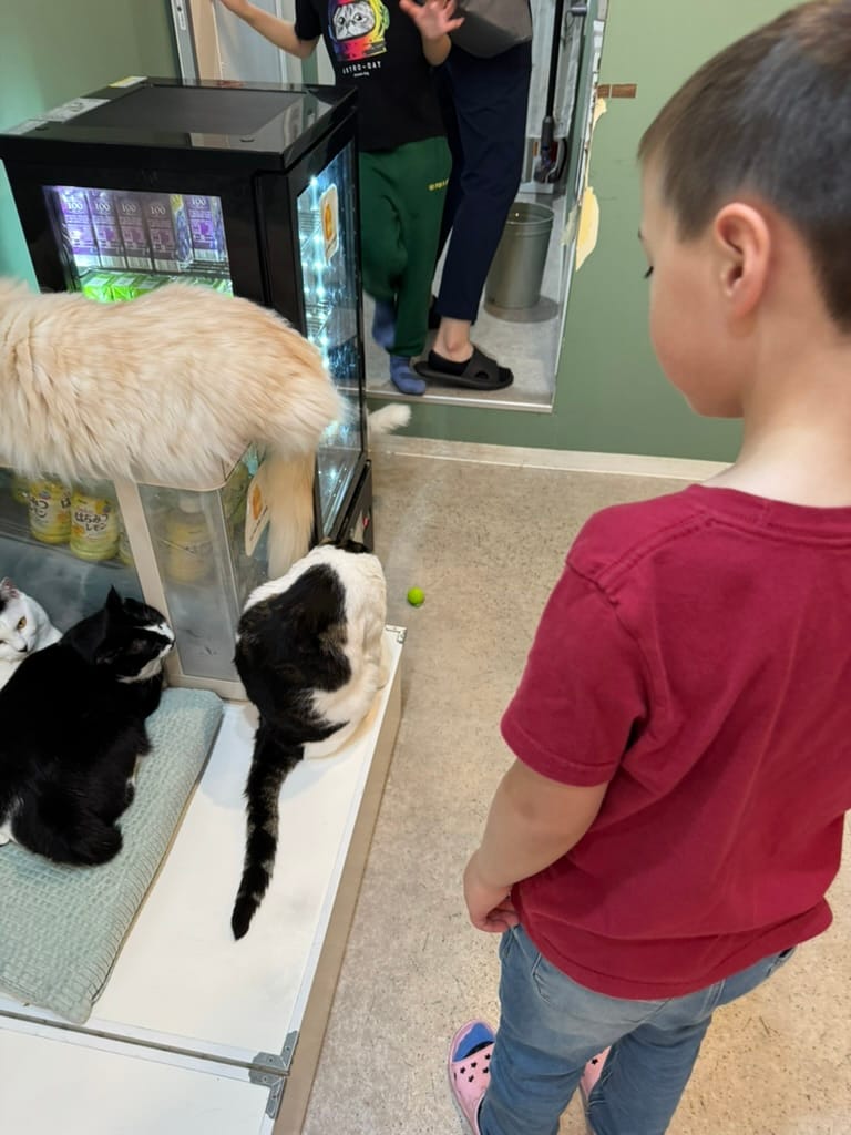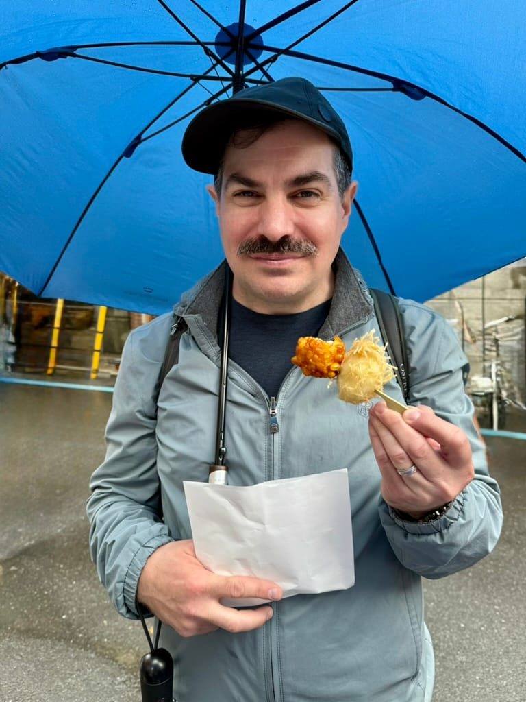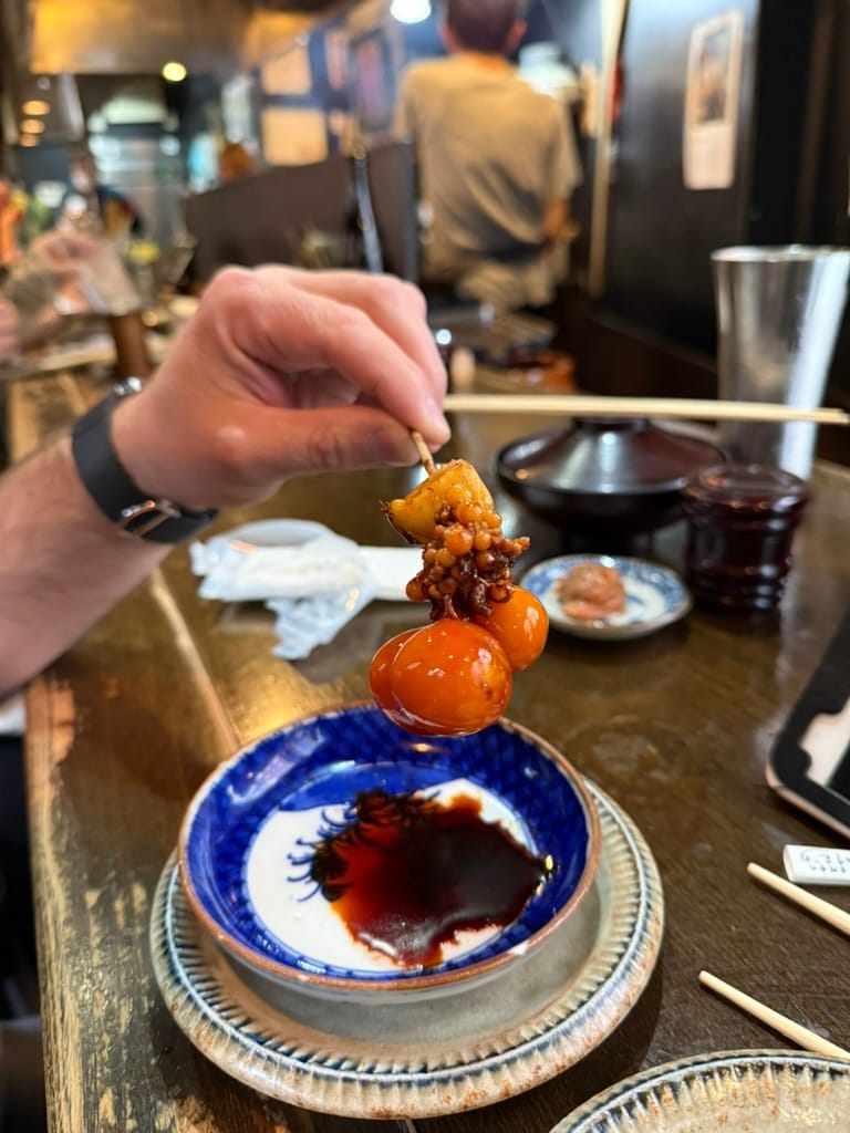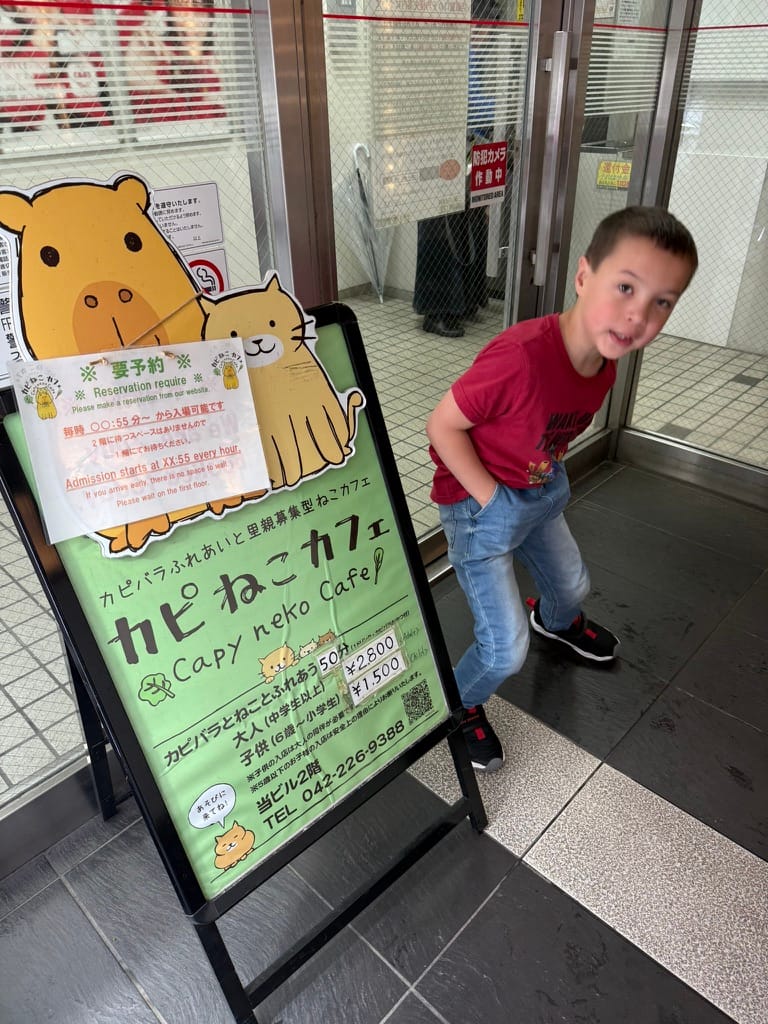 After our big morning at the market, we took Matthew and Nico to another animal cafe. This one was a capybara and cat cafe. It was really hard to get a reservation there so only Matthew and Nico could go. They had so much fun! When we met up with them again afterwards Nico had the biggest smile on his face. While Matthew and Nico were enjoying the animals, Lee and I found a tiny little restaurant around the corner where we enjoyed a couple of drinks while we were waiting. As we were sitting there, we kept seeing the cook make, what I thought looked like cherry tomatoes, except they weren't. Lee browsed through the menu and found it. It was barbecued chicken ovaries. Lee pressured me into trying it. The cook brought it to us and explained you are meant to eat it all in one bite. So I did, the visuals and texture were not appetizing at all, nor was the popping of the ovaries when I bit down, but the flavor was actually quite good. It tasted like creamy eggs. Would I do it again? No thanks.