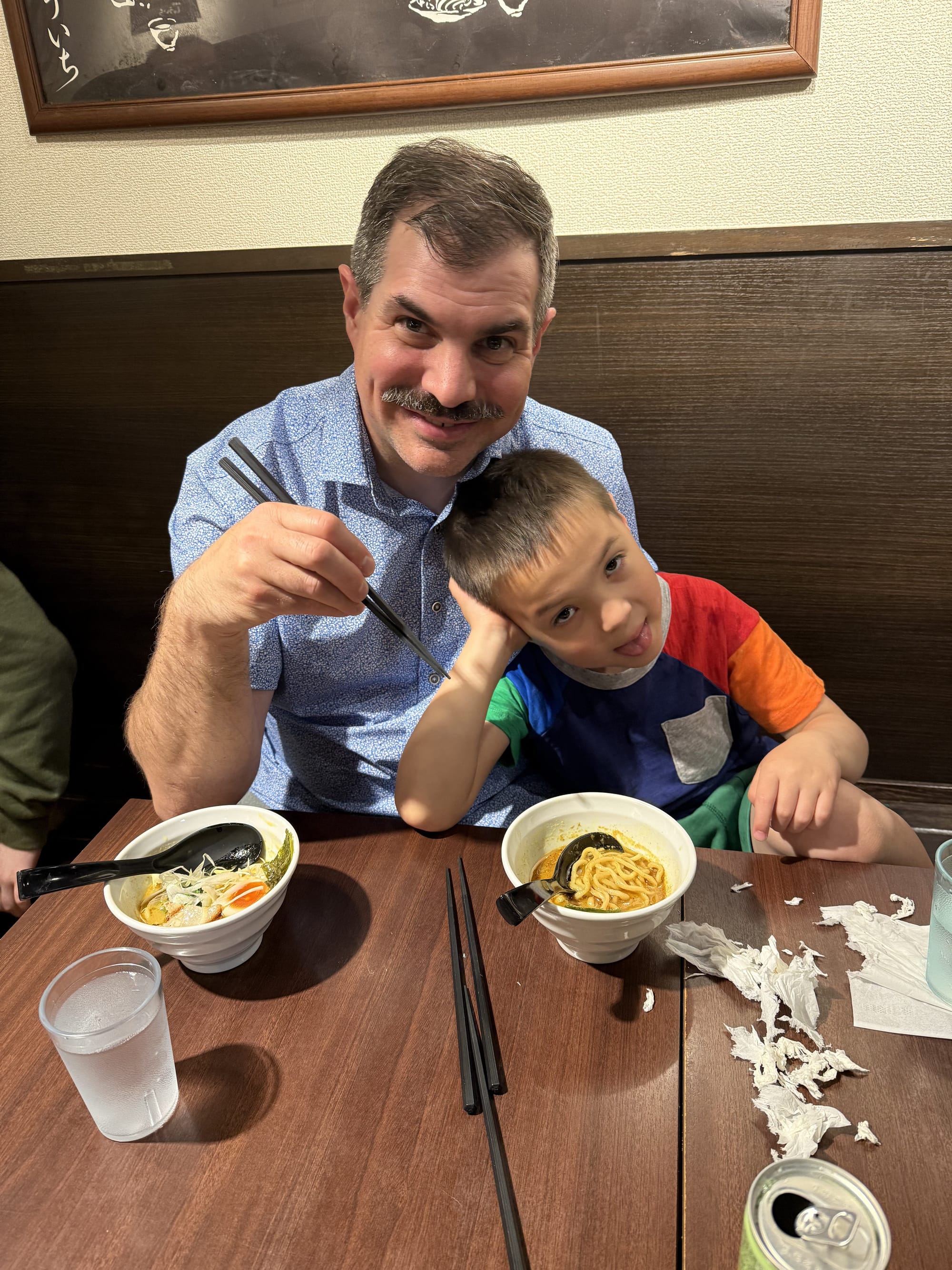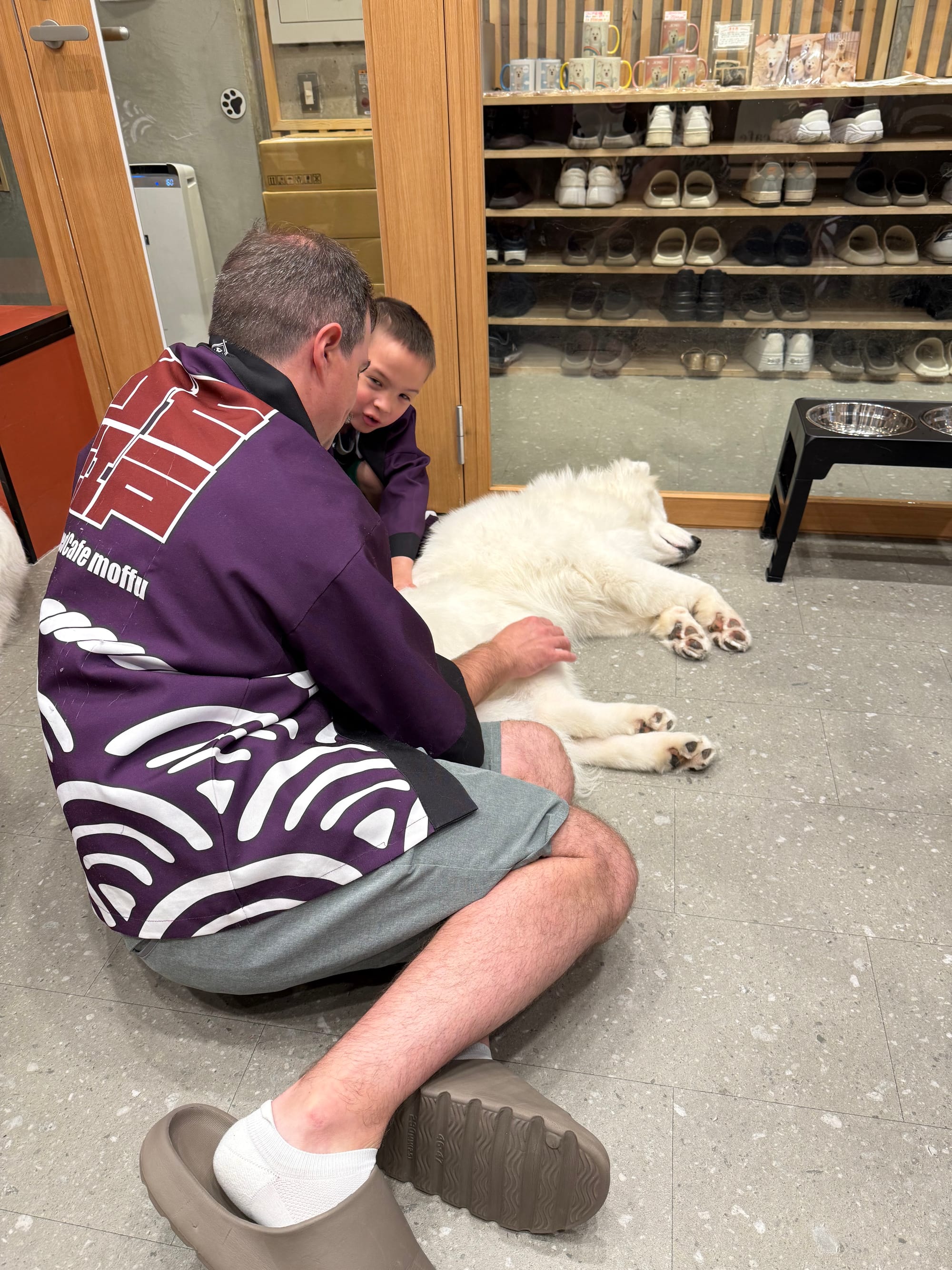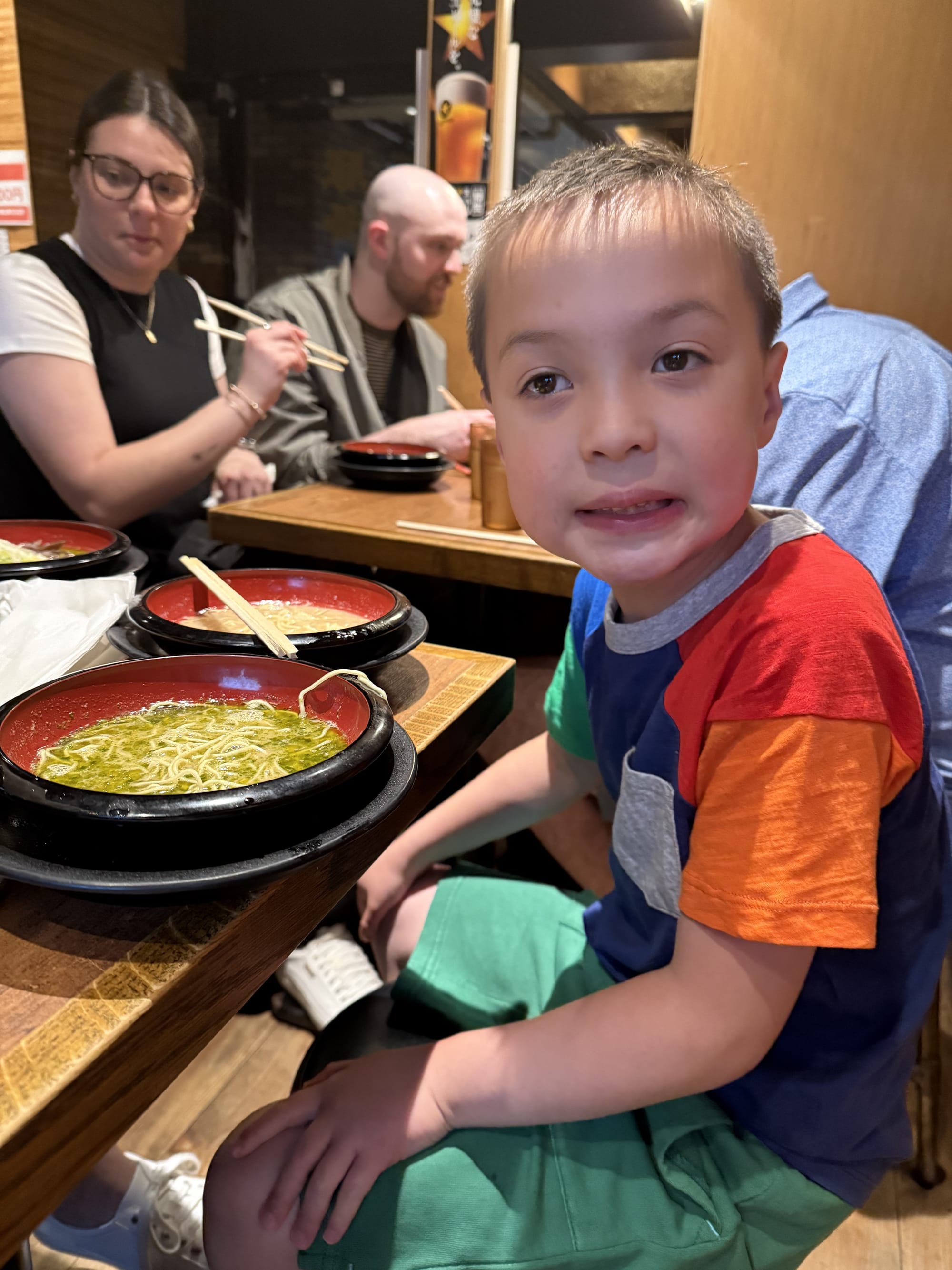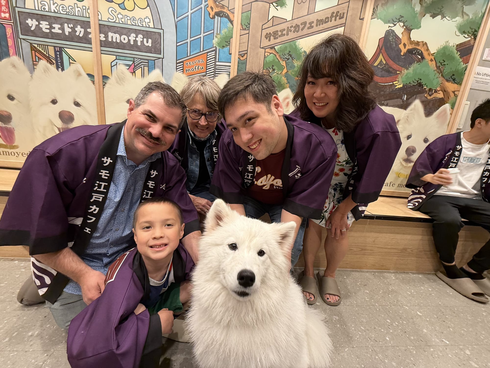 Today was Nico's favorite day so far. We started out with breakfast at the hotel where he had Japanese pancakes (they are very much like the ones you are familiar with, but they are much fluffier). Then we took the train to Shibuya, a borough of Tokyo. There we had crepes, and visited three different animal cafes. We went to an otter cafe, where Lee quickly was bitten by an otter on the foot, a pig cafe, where the pigs would fight over who got to snuggle with you, and finally a Samoyed dog cafe, where we got to pet the white fluffy dogs. After all that we met up with a ramen tasting tour. We went to three ramen restaurants and had two bowls at each restaurant. Surprisingly, Nico loved that. He couldn't stop talking about how much he loved the ramen. And finally when we had to head back, Matthew picked up the reigns as our navigator. He got us to the train stations, navigated us through a train transfer and got us safely back to our hotel. A very successful day for us!